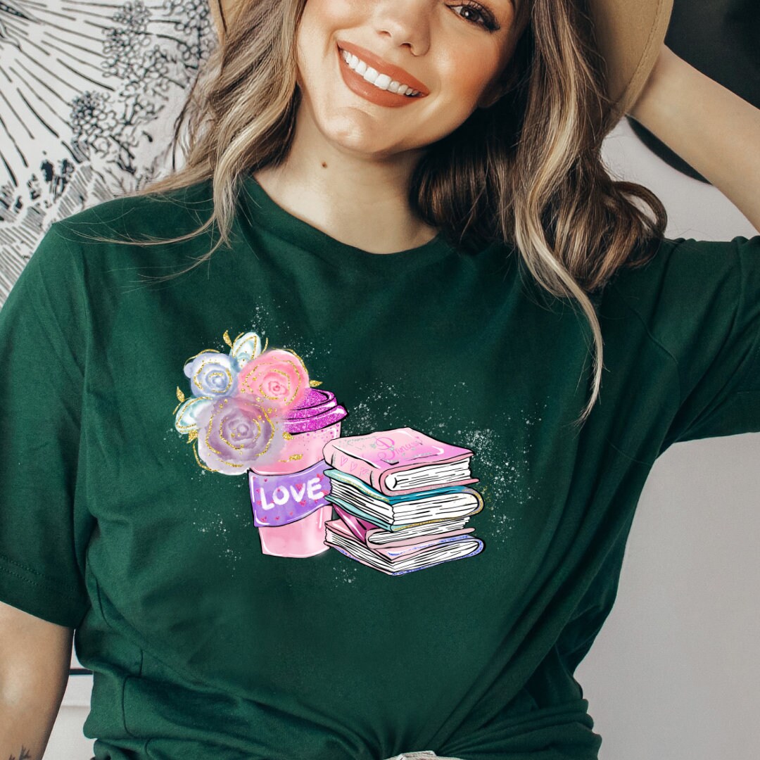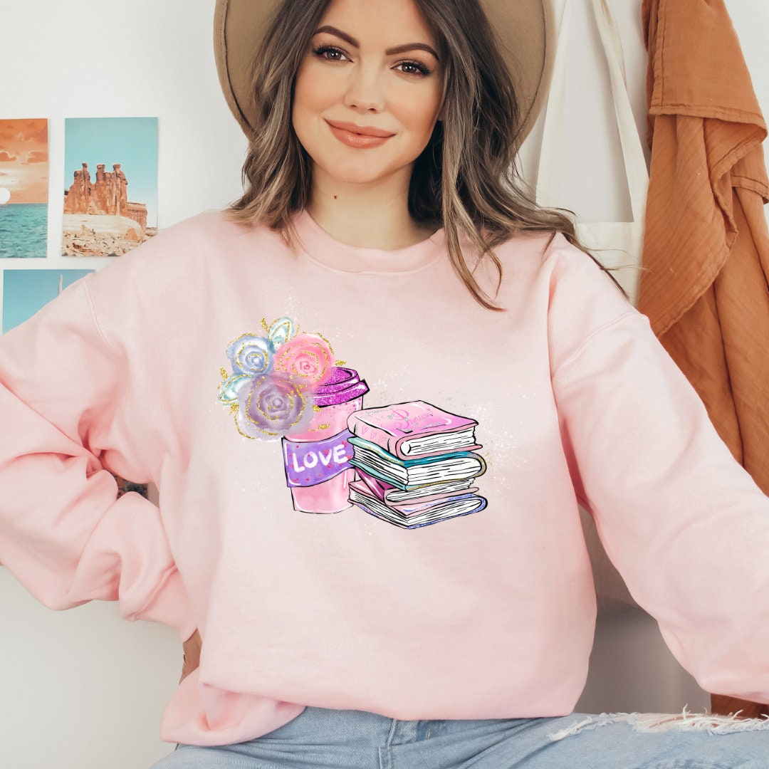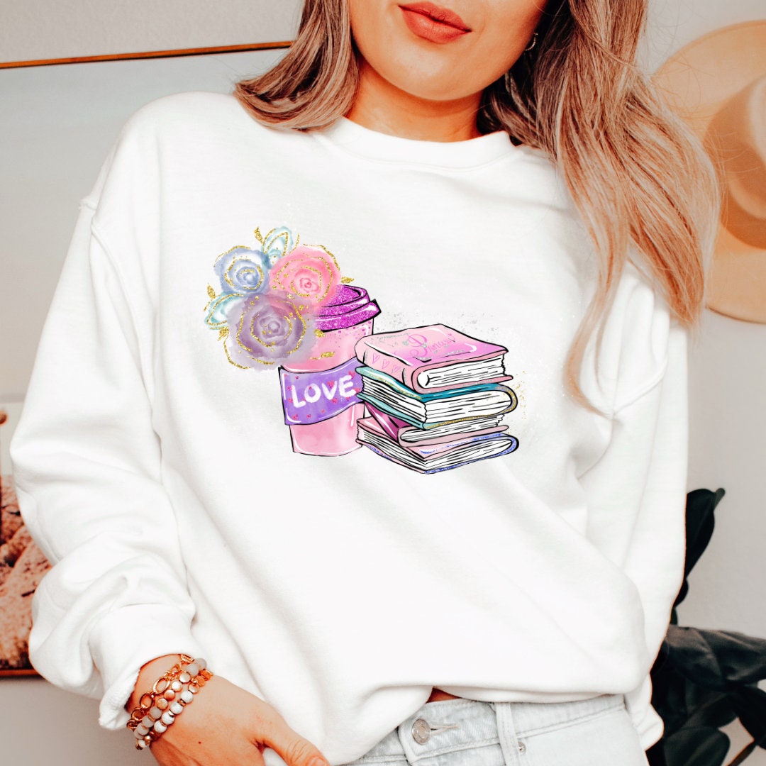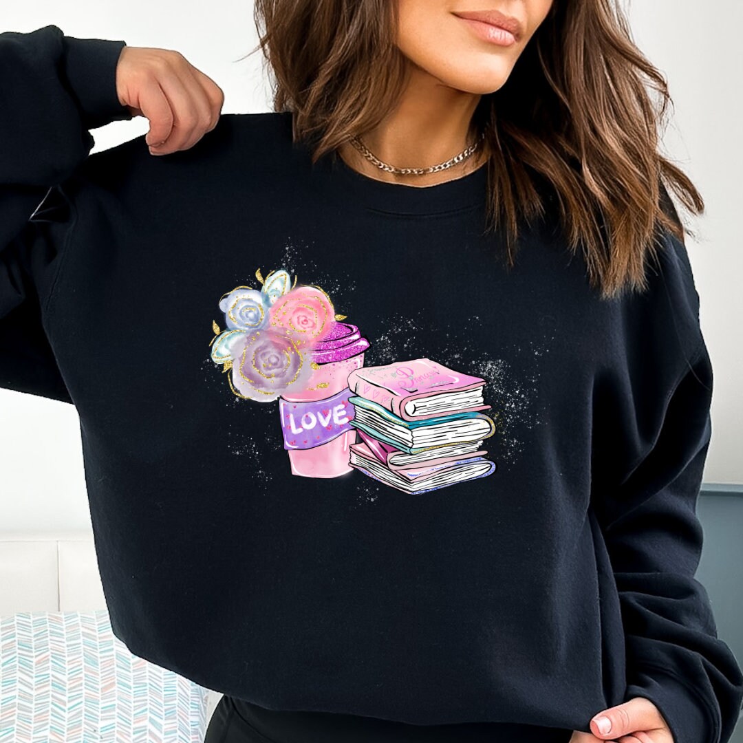 Book sweatshirt, gift for book lovers, book lover sweatshirt, t-shirt with book and flowers, coffee and book lover